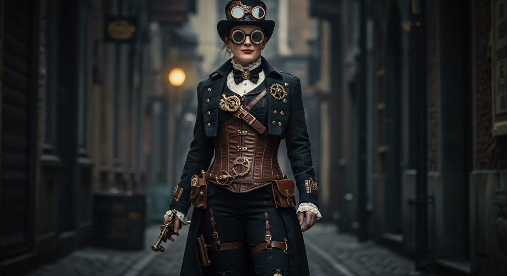 Стиль стимпанк — это богатое переплетение исторических мотивов и научной фантастики, что отражается в одежде, объединяющей викторианскую строгость с индустриальной грубостью. Главной особенностью является использование элементов, напоминающих детали паровых машин и механических устройств — шестерёнки, ремни, металлические застёжки и пряжки, цепочки и кожаные вставки. Образы выглядят одновременно элегантно и вызывающе, позволяя создавать уникальные костюмы, которые привлекают внимание своим сложным и продуманным дизайном.